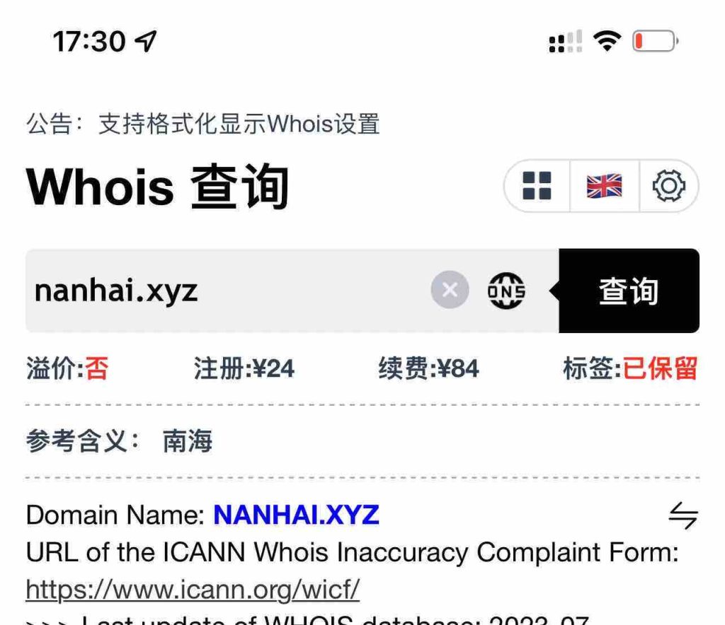 起初因为她,注册了域名:nvhai.xyz 偶然间想到,该配个男孩:nanhai.xyz 发现如下面第一张图片一样,显示被保留。 经过半年努力,如愿以偿的凑成了一对。 域名不怎么样,但心情很好,哈哈哈。